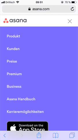 Das Hamburger Menu kennt jeder und ist die häufigste Variante der mobilen Navigation. Meist nur durch drei horizontale Striche gekennzeichnet (der „Hamburger“), öffnet sich auf Touch von oben, rechts oder links ein Menü.